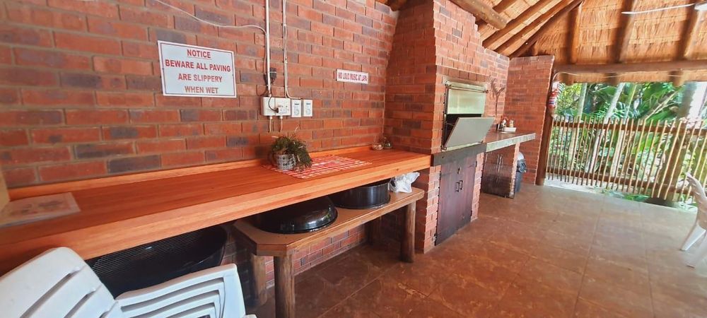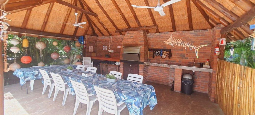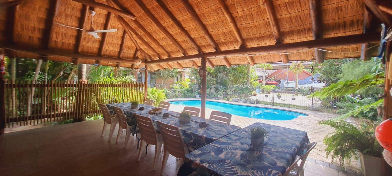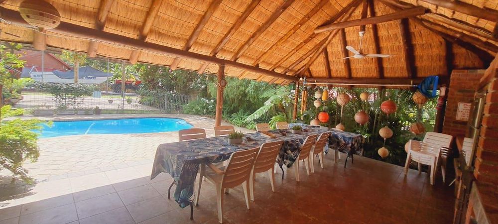 - Thatched entertainment area with pool